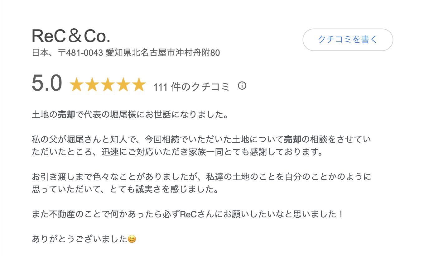 - 土地の売却で代表の堀尾様にお世話になりました。私の父が堀尾さんと知人で、今回相続でいただいた土地について売却の相談をさせていただいたところ、迅速にご対応いただき家族一同とても感謝しております。