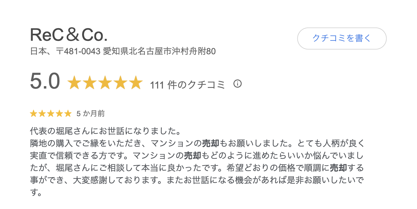 - この度、マンションの売却でお世話になりました。初めての売却でわからないことだらけでしたが、代表の堀尾さんが、とても丁寧に説明してくださり、安心してお任せできました。希望に近い価格でスムーズに売却でき、大変満足しています。もし次の機会があれば、またお願いしたいです!